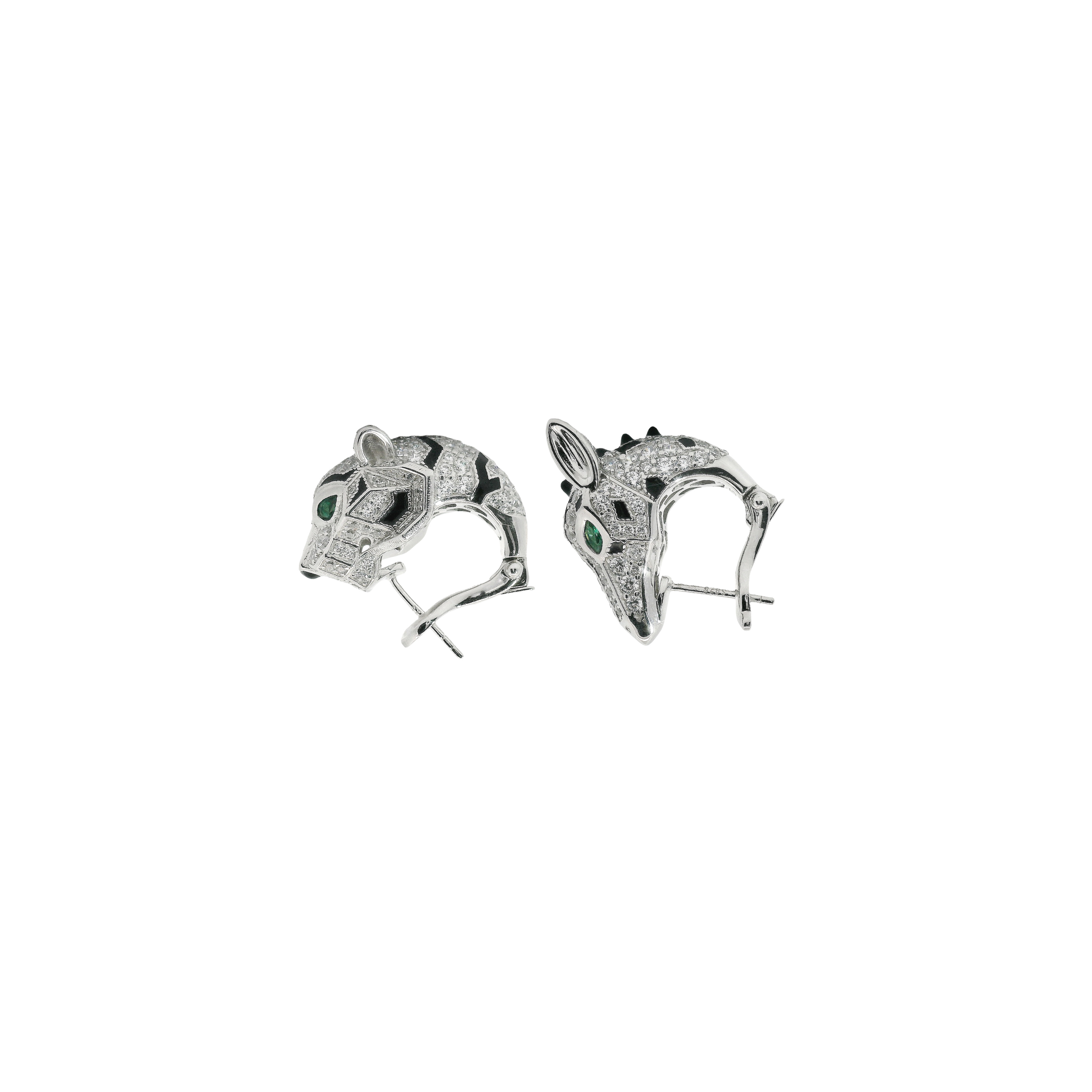 Orecchini con forma di animale in argento 925 placcato oro bianco con pietre in moissanite trasparenti e verdi.